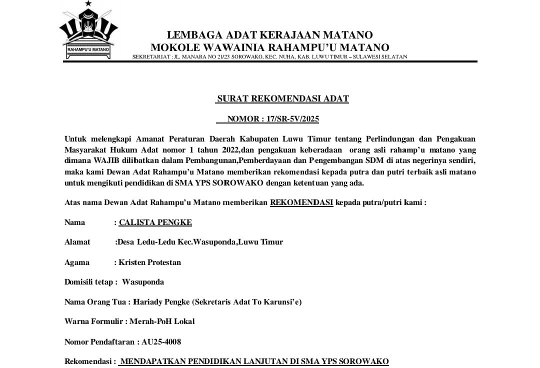 Dalam Surat Rekomendasi Adat Nomor: 17/SR-5V/2025, Dewan Adat Rahampu’u Matano secara tegas merekomendasikan Calista Pengke untuk mendapatkan hak pendidikan di SMA YPS Sorowako.