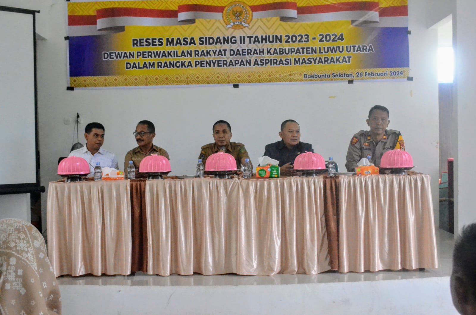 BAEBUNTA, TEKAPE.co – Anggota DPRD Kabupaten Luwu Utara, daerah pemilihan IV melakukan reses pertama hari ini di Kantor Kecamatan Baebunta Selatan, Senin 26 Februari 2024.