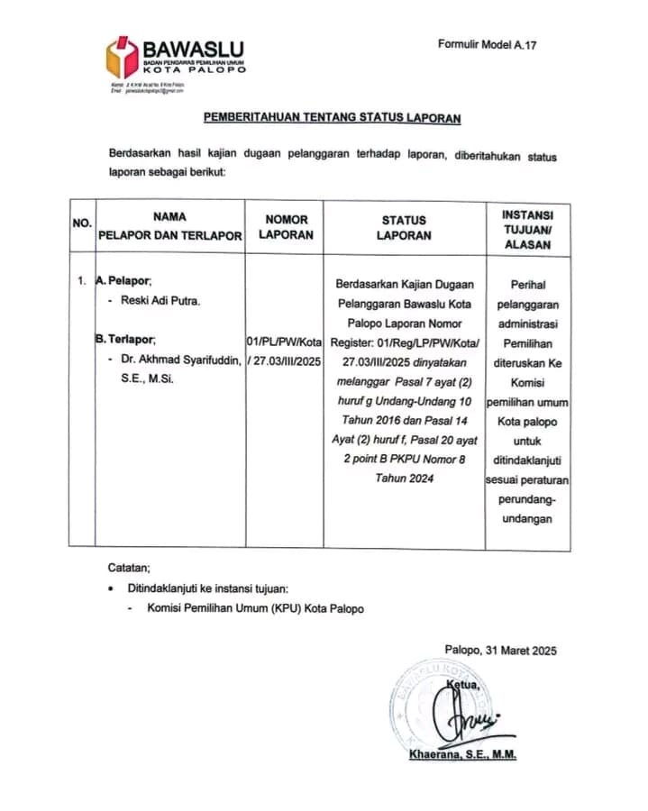 Perkara itu berlanjut hingga tingkat banding. Status laporan ini telah diumumkan pada papan pengumuman KPU Palopo, sementara keputusan akhir kini berada di tangan KPU.(*)