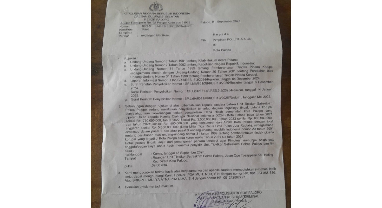 Beredar Surat Panggilan Polres Palopo Soal Dugaan Korupsi Dana Hibah KONI