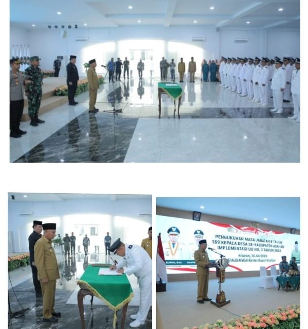ASAHAN, TEKAPE.co – Bupati Asahan H. Surya BSc mengukuhkan masa jabatan 8 tahun kepada 169 Kepala Desa se-Kabupaten Asahan berdasarkan Implementasi UU No. 3 Tahun 2024 di Aula Melati Kantor Bupati Asahan, Selasa (16/07/2024).