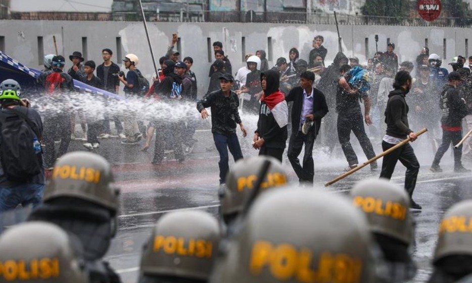 Polisi yang berjaga langsung memukul mundur massa menggunakan water cannon.