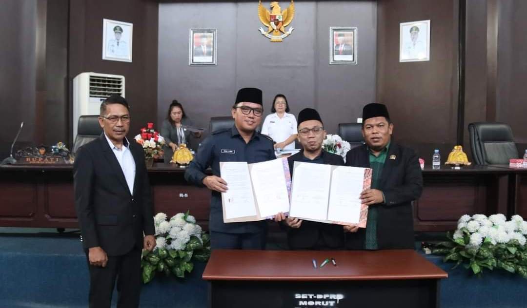 Penandatanganan persetujuan bersama, atas rancangan APBD-P TA 2023 dan 2 Ranperda, oleh Bupati Delis, bersama Wakil Ketua II DPRD Morut, Muhammad Safri. (ist)