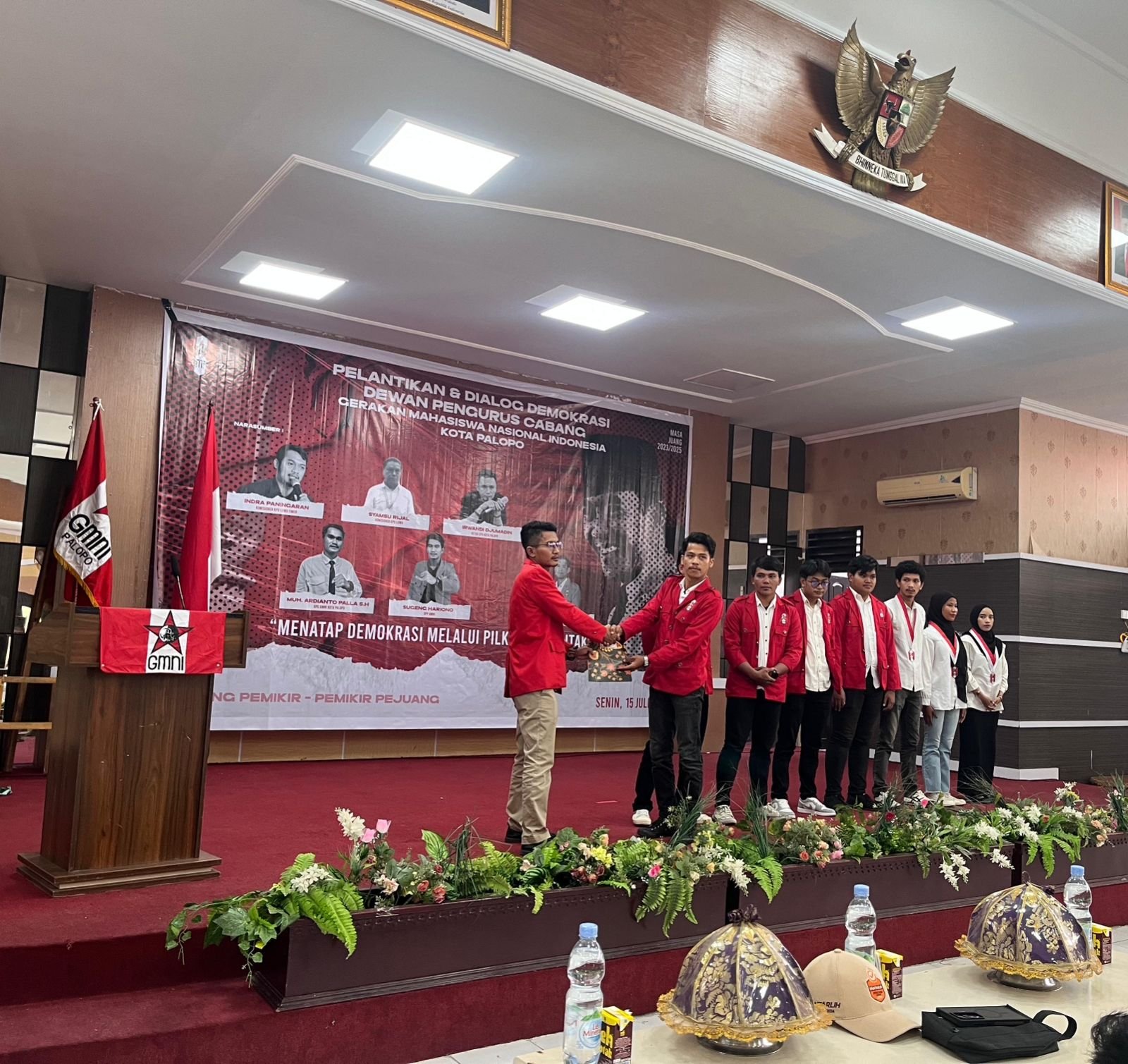 Ketua DPC GMNI Kota Palopo, Juan, berjabat tangan dengan salah seorang pengurus GMNI usai prosesi pelantikan Dewan Pengurus Cabang GMNI Kota Palopo dalam kegiatan Pelantikan dan Dialog Demokrasi, yang digelar di Aula Pertemuan, Senin (15/6/2025). (ist)