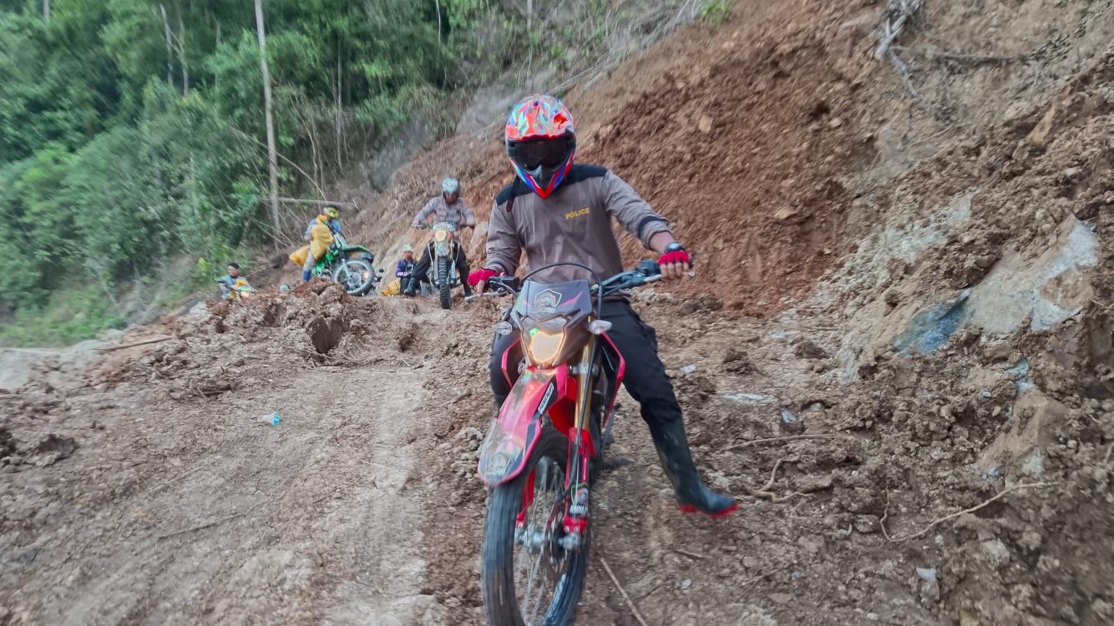 Meski menggunakan sepeda motor trail, tak jarang Kapolres Palopo beserta tim alami jatuh bangun lantaran medan berbatu, menanjak material longsor dan juga berlumpur.
