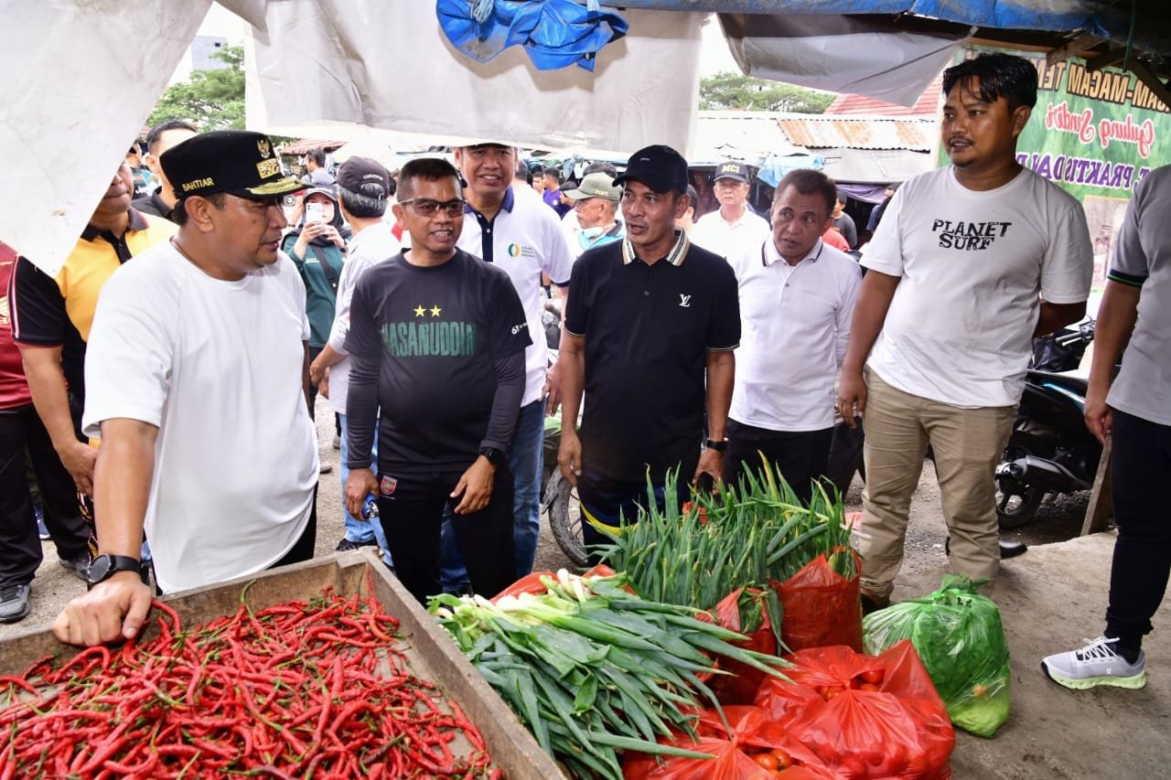 BONE, TEKAPE.co – Penjabat Gubernur Sulsel, Bahtiar Baharuddin, meninjau lokasi pasar murah yang digelar Dinas Perindustrian dan Perdagangan (Disperindag) Sulsel, bekerjasama dengan Pemerintah Kabupaten Bone, di Kawasan Stadion La Patau, Minggu, 19 November 2023.