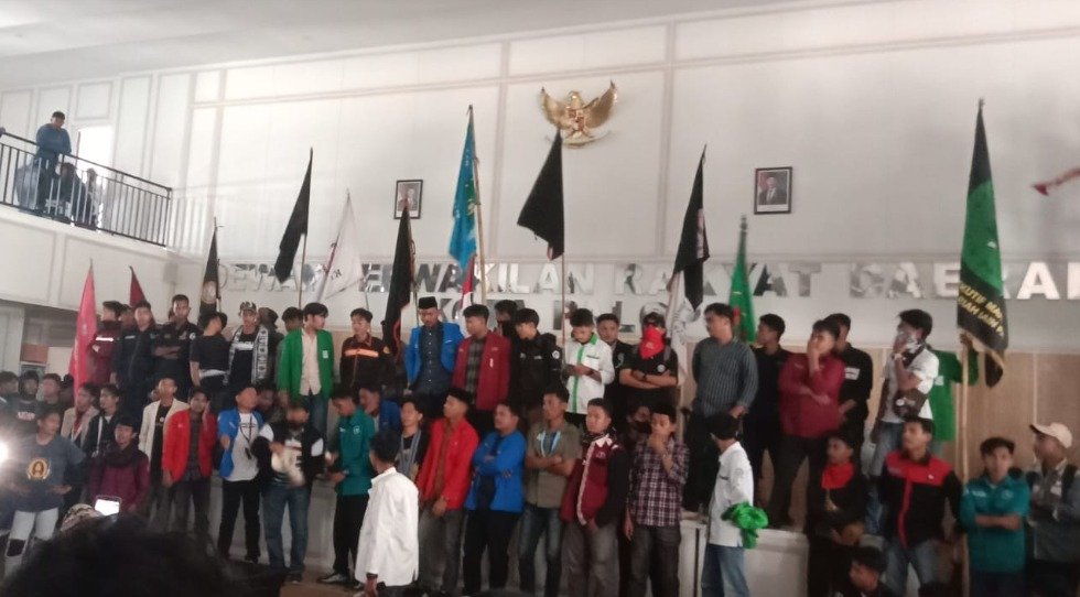 Massa merangsek masuk ke ruang rapat paripurna DPRD.