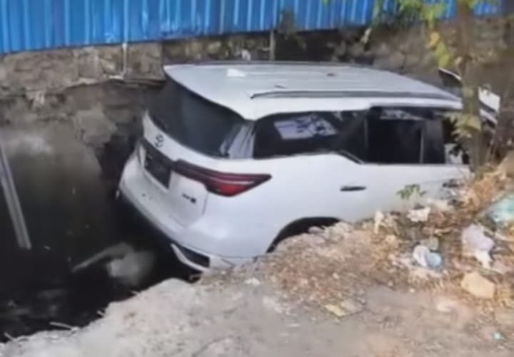 MAKASSAR, TEKAPE.co – Sebuah mobil Fortuner warna putih masuk ke selokan di Jl Sultan Alauddin-AP Pettarani, Makassar, Kamis 16 November 2023 pagi.