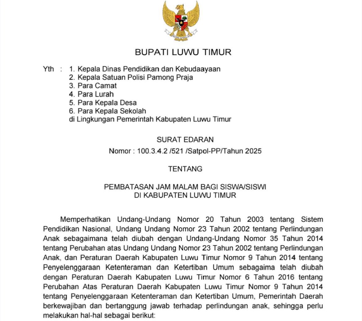 MALILI, TEKAPE.co — Bupati Luwu Timur, Irwan Bachri Syam, resmi menerbitkan surat edaran yang membatasi aktivitas pelajar di luar rumah pada malam hari.