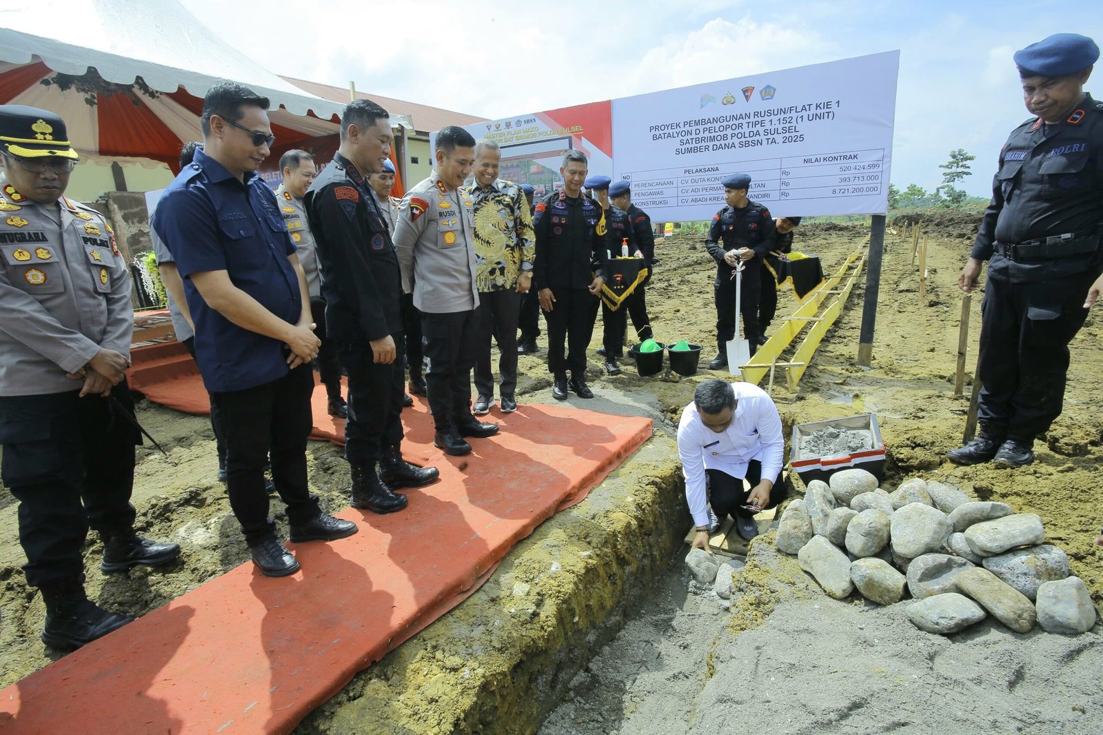 Prosesi peletakan batu pertama diawali oleh Kapolda Sulsel dan dilanjutkan oleh Bupati Luwu H. Patahuddin, mantan Bupati Luwu Drs. H. Basmin Mattayang, M.Pd, Dansat Brimob Polda Sulsel Kombes Pol Heru Novianto, S.I.K., M.H., serta Ketua DPRD Kabupaten Luwu Ahmad Gazali.
