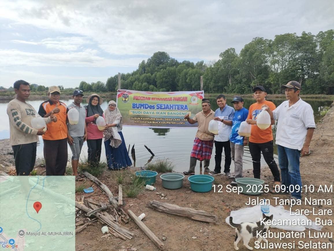 LUWU, TEKAPE.co – Pemerintah Desa Lare-lare, Kecamatan Bua, Kabupaten Luwu, mulai merealisasikan program ketahanan pangan melalui budidaya ikan bandeng. Program ini dijalankan oleh Badan Usaha Milik Desa (BUMDes) Sejahtera.