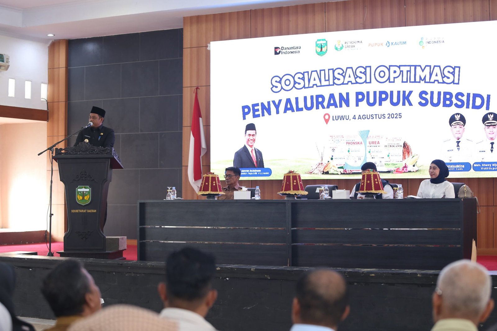 Bupati Luwu, H. Patahudding, S.Ag, memberikan sambutan saat membuka kegiatan Sosialisasi Optimalisasi Penyaluran Pupuk Subsidi yang digelar di Aula Andi Kambo, Kompleks Perkantoran Bupati Luwu, Senin (4/8/2025). (ist)