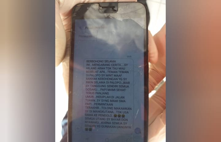 Dari handphone yang ditemukan di TKP, korban menulis pesan yang intinya berisi permintaan maaf kepada keluarganya bahwa terpaksa mengakhiri hidup karena terlilit utang.