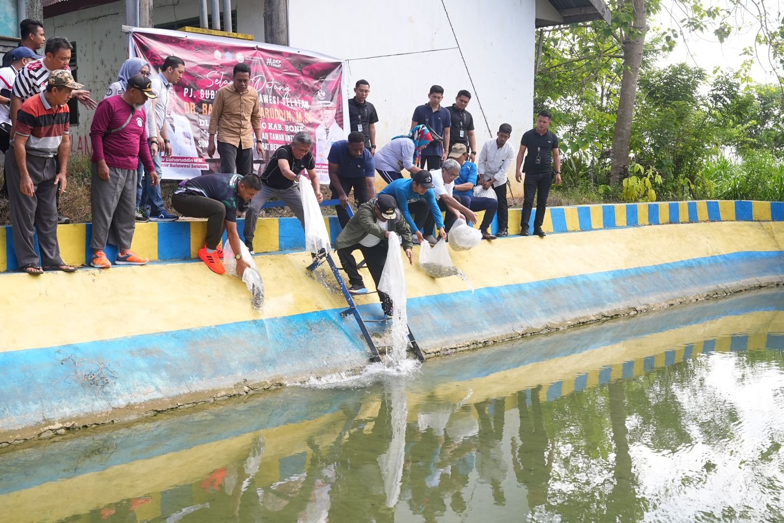 Pj Gubernur Sulsel Bahtiar Baharuddin, Kepala DKP Sulsel M Ilyas, dan Pj Bupati Bone Andi Islamuddin melepas 21 ribu benih ikan nila di kolam Wollangi, Kecamatan Barebbo, Bone, Minggu 26 November 2023. (ist)
