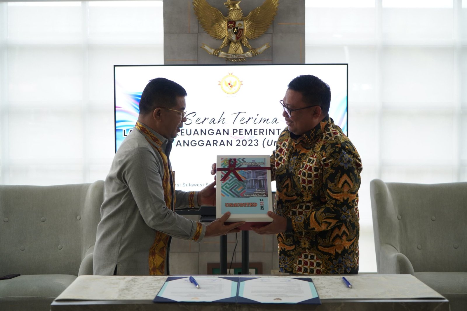 Pejabat Wali Kota Palopo Asrul Sani menyerahkan Laporan Keuangan Unaudited Kota Palopo Tahun Anggaran 2023 keapda BPK Sulsel. (ist)