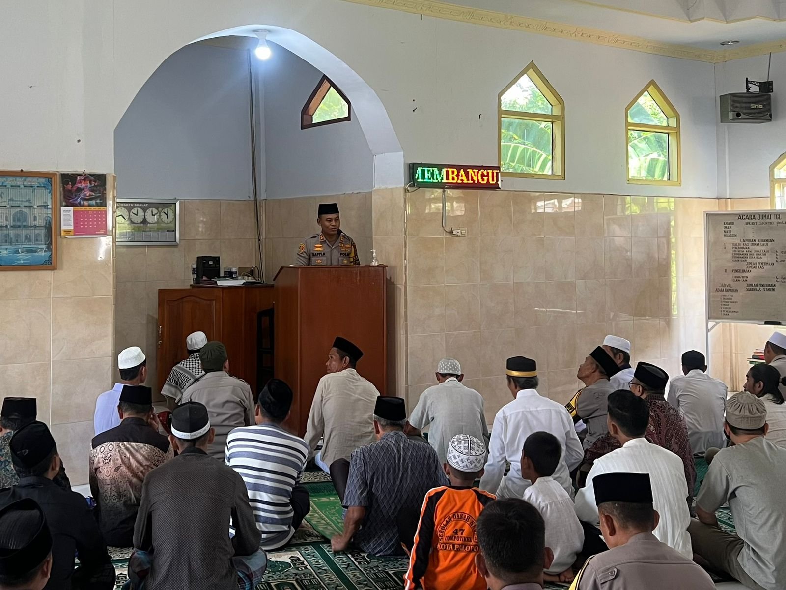 Dalam kesempatan tersebut, seluruh rangkaian acara di masjid, mulai dari adzan hingga imam sholat Jumat, dipimpin Polisi Santri. Seusai pelaksanaan sholat Jumat, Kapolres Palopo memberikan imbauan Kamtibmas kepada para jamaah, menekankan pentingnya peran masyarakat dalam menjaga stabilitas keamanan selama Pilkada berlangsung.