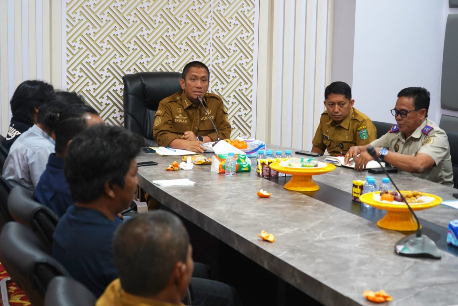 Bupati Luwu Timur, Irwan Bachri Syam, menggelar rapat bersama Dinas Transmigrasi dan Tenaga Kerja, Badan Pertanahan Nasional (BPN), serta perwakilan warga di Ruang Rapat Bupati, Selasa malam (30/09/2025). (hms)