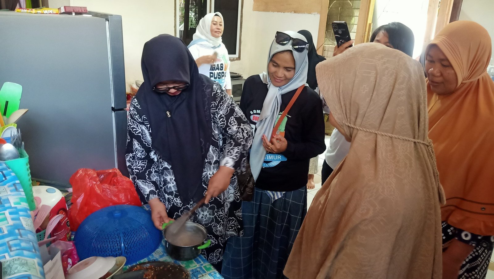 Setelah sampai di lokasi, ia langsung ke dapur meracik kapurung (makanan khas Luwu terbuat dari sagu) bersama emak-emak lainnya.