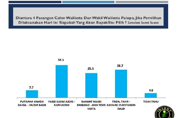 Ada empat paslon yang bertarung di Pilkada Palopo, disurvei, yakni paslon nomor urut 1 Putri Dakka-Haidir Basir (PD-HB), paslon nomor urut 2 Farid Kasim Judas-Nurhaenih (FKJ-Nur), paslon nomor urut 3 Rahmat Masri Bandaso-Andi Tenri Karta (RMB-ATK), dan paslon nomor urut 4 Trisal Tahir-Akhmad Syarifuddin (Trisal-Ome).
