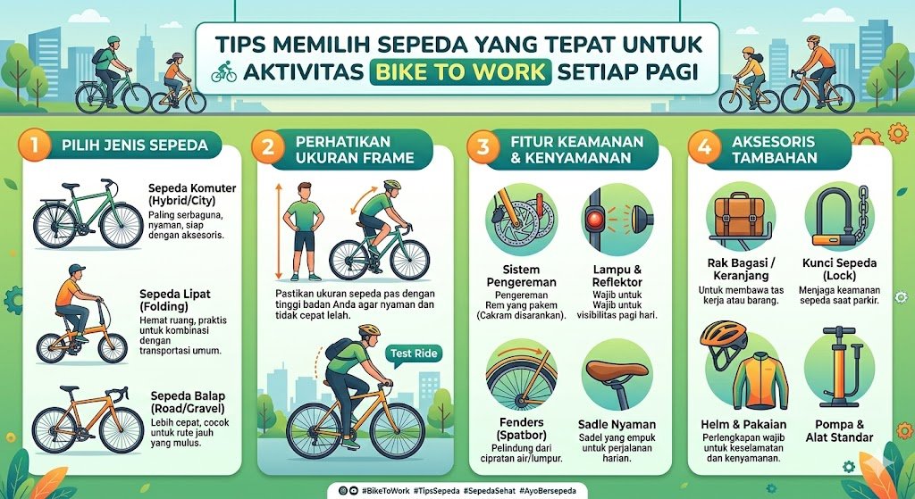 Memulai kebiasaan bersepeda ke kantor atau bike to work merupakan langkah cerdas untuk menjaga kebugaran tubuh sekaligus berkontribusi mengurangi polusi udara. Namun, kenyamanan selama perjalanan sangat bergantung pada jenis sepeda yang Anda gunakan setiap pagi. Memilih sepeda yang tidak sesuai dengan rute perjalanan justru dapat membuat Anda merasa cepat lelah atau bahkan mengalami nyeri sendi. Oleh karena itu, penting bagi setiap pekerja untuk memahami spesifikasi dasar yang dibutuhkan agar aktivitas bersepeda menjadi pengalaman yang menyenangkan dan bukan beban tambahan sebelum mulai bekerja di kantor.