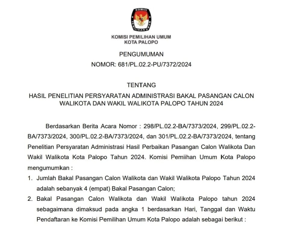 PALOPO, TEKAPE.co – Komisi Pemilihan Umum (KPU) Kota Palopo mengumumkan Hasil Penelitian Persyaratan Administrasi Bakal Pasangan Calon Walikota dan Wakil Walikota Palopo Tahun 2024, tertanggal 13 September 2024, yang ditandatangani Ketua KPU Kota Palopo, Irwandi Djumadin.