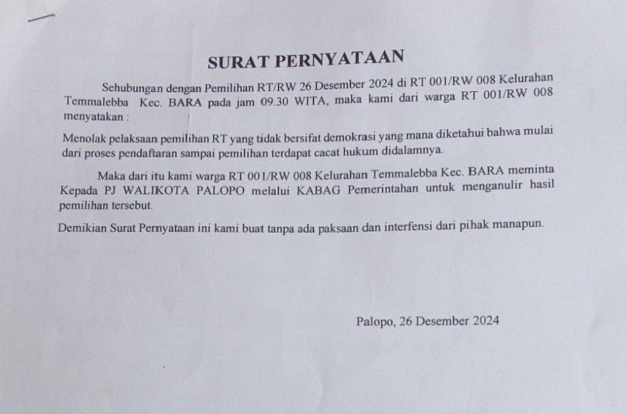 Dalam surat pernyataan itu, warga meminta Penjabat Wali Kota Palopo melalui Kepala Bagian Pemerintahan untuk membatalkan hasil pemilihan.